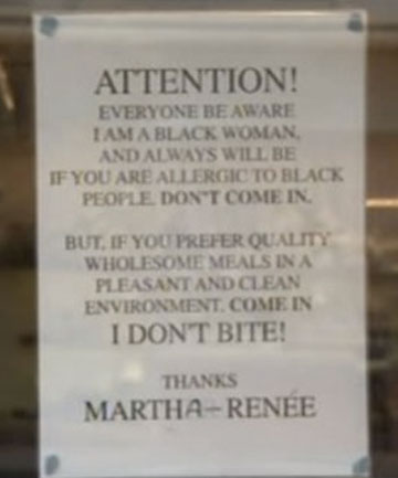 She said she was sick of people walking out of her cafe’ when they saw the color of her skin. So she put a sign in the front window of her restaurant, “telling racist white people not to come in if they don’t like the fact that she is a black woman.”