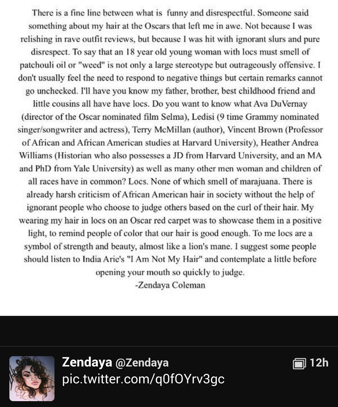 “There is a fine line between what is funny and disrespectful. Someone said something about my hair at the Oscars that left me in awe,” the actress posted on Twitter.
