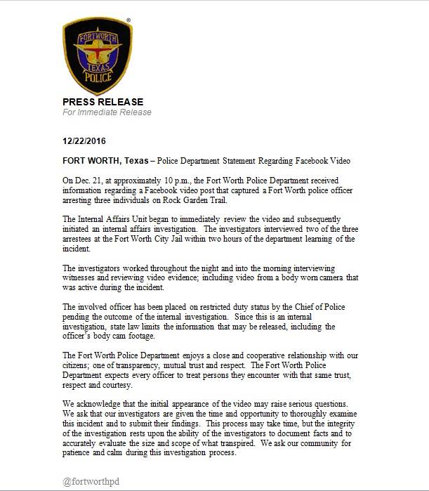 In a statement released on Facebook, the Fort Worth police department said they received information about a video post around 10 p.m. Wednesday, December 21st and that there is an internal review in process.