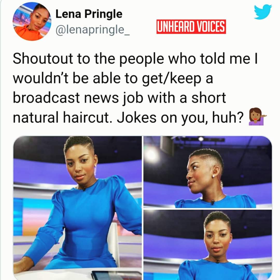 “Shoutout to the people who told me I wouldn’t be able to get/keep a broadcast news job with a short natural haircut,” she wrote. “Jokes on you, huh?”