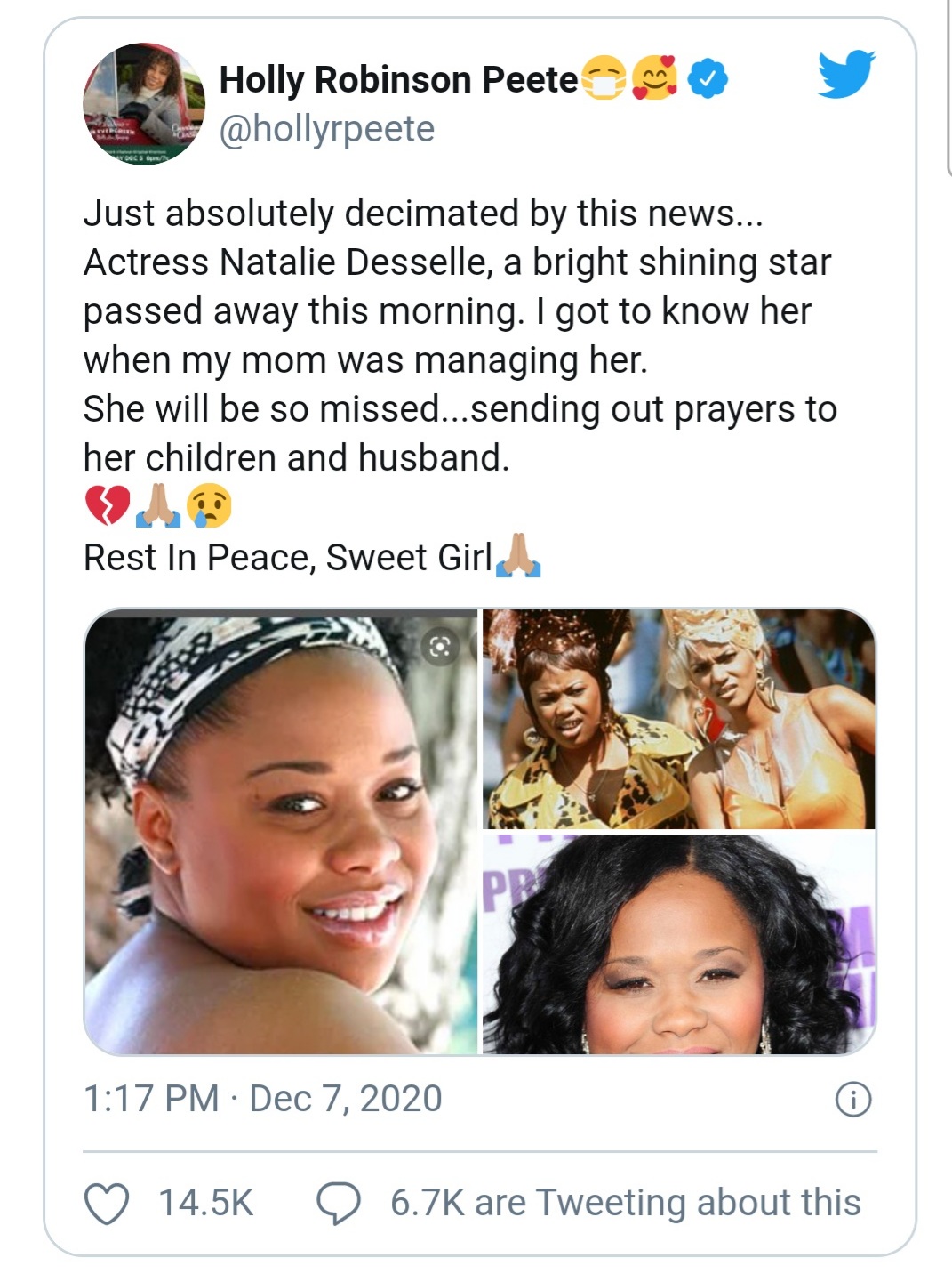 “Just absolutely decimated by this news…Actress Natalie Desselle, a bright shining star passed away this morning,” she tweeted. “I got to know her when my mom was managing her. She will be so missed…sending out prayers to her children and husband. Rest In Peace, Sweet Girl.”