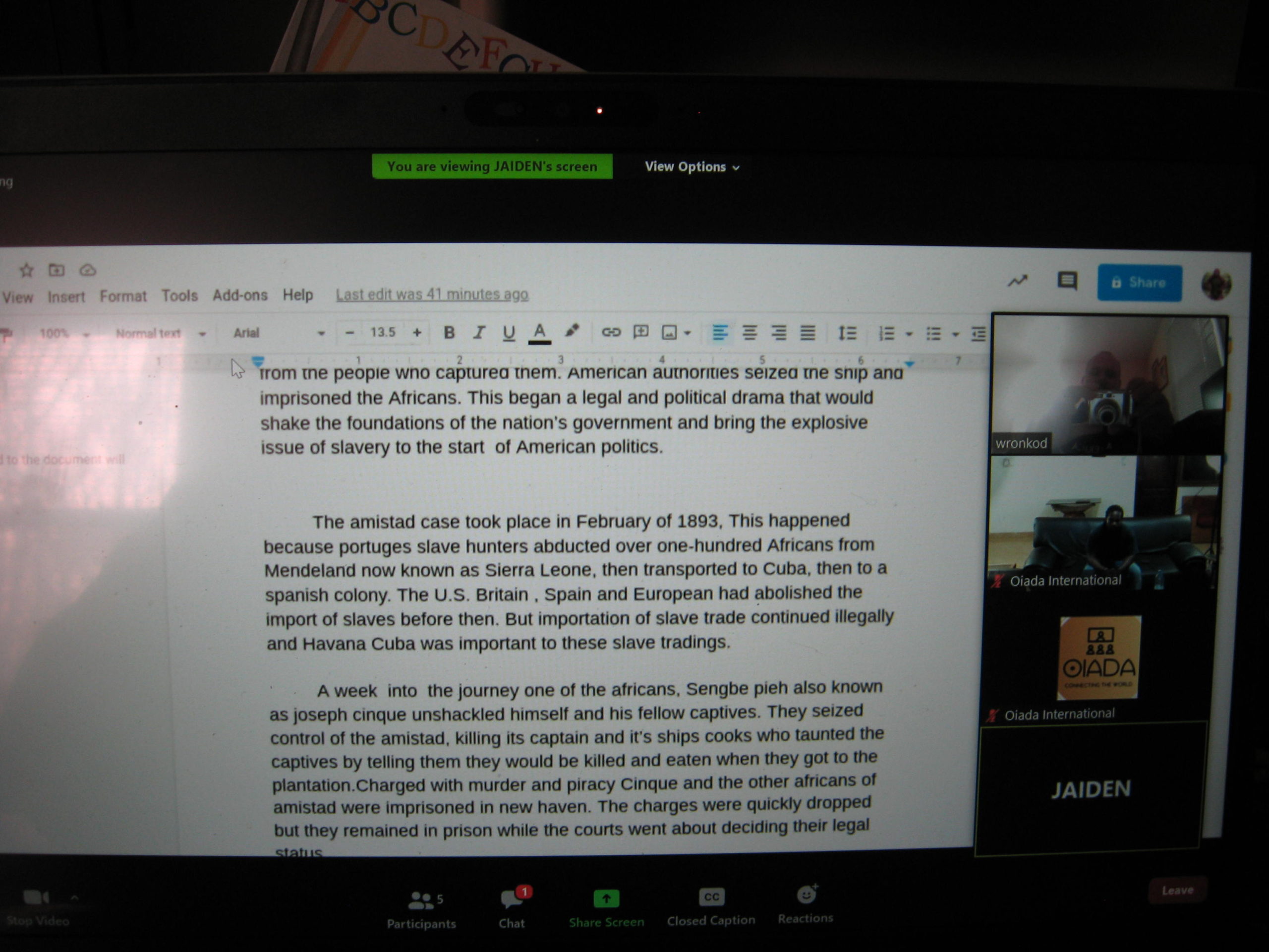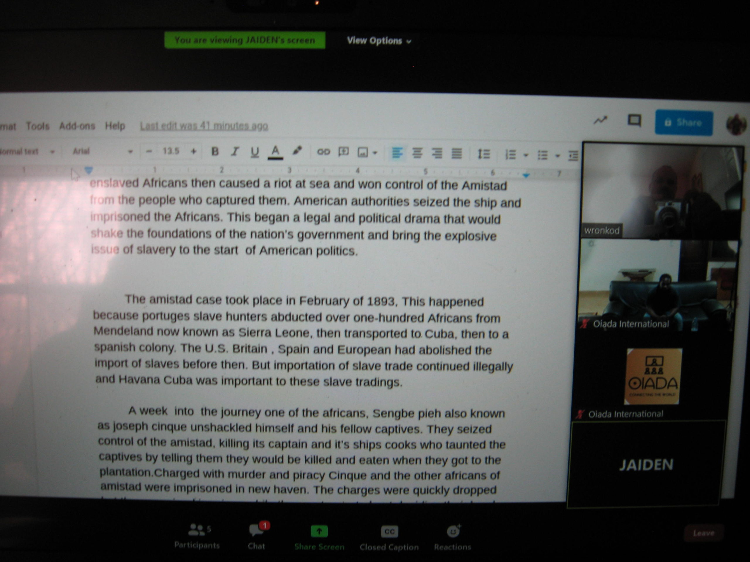At the end of 2020, Mr. Wronko’s students, Jaiden Tyler, Dain Salazar, and Jazier Crawford presented their Google Slide Presentations on “Why there was slavery in the North” to Papa Williams’ students at the Solid Rock Foundation School in Ghana.
