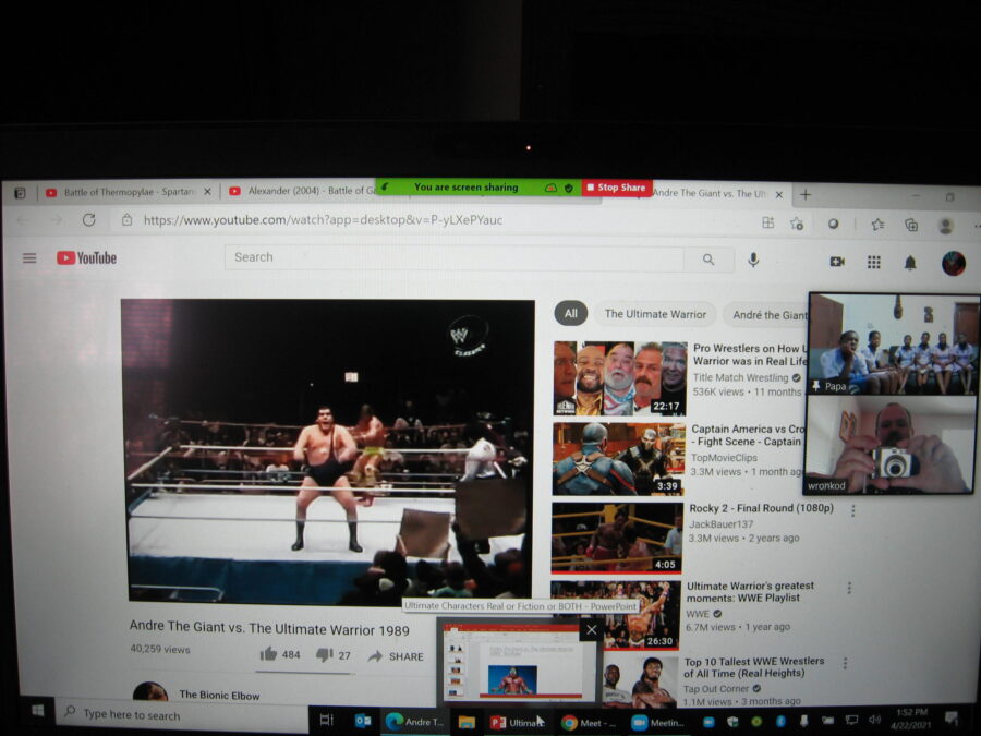 A clip that I showed them also had a character that was a living giant that could of been believed to be fictional, which was Andre the Giant. The clip was a wrestling match between Andre the Giant and the Ultimate Warrior.