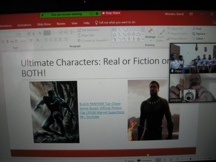 Just recently Mr. Wronko had a video conference with the students from the Solid Rock Foundation school in Ghana. The topic was Ultimate Characters: Real or Fiction or Both!