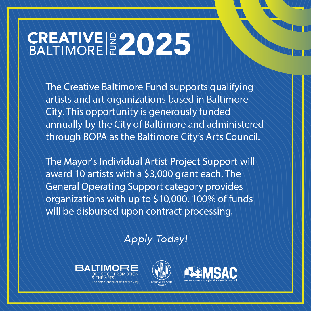 Visit promotion and arts to get the Zoom link, learn more about the Creative Baltimore Fund program, and how to apply.