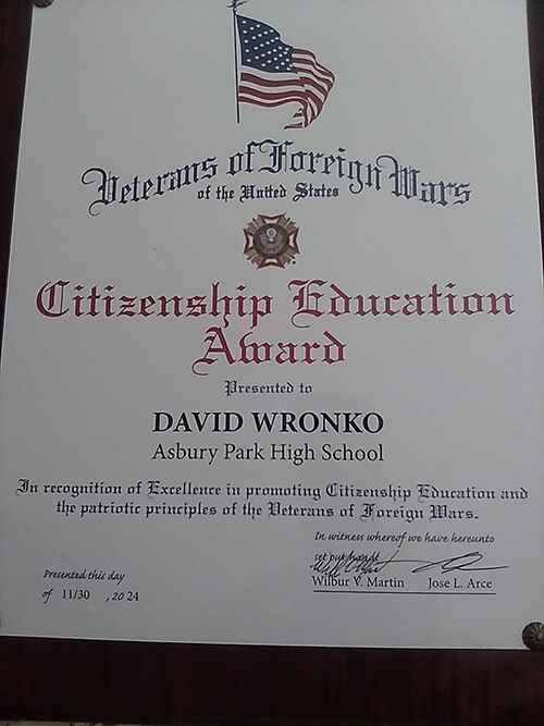 On February 19, VFW Veterans, Wilbur V. Martin, Vietnam Veteran, his wife Denise Martin, George Reed, Vietnam Veteran, and Ken Hodges came to Asbury Park High School to present awards to principal Dr. Perry Medina and Mr. David Wronko, history teacher.