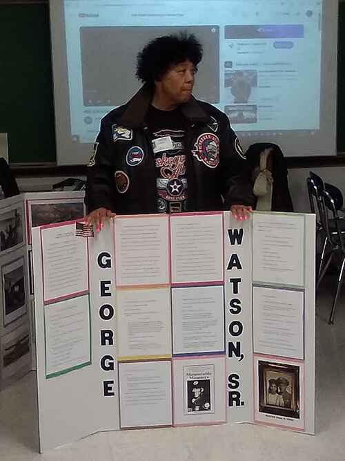 Watson gave a presentation about the role the Tuskegee Airmen played in helping America win World War II. Through the use of multiple visuals and clips from the movie Red Tails, Ms. Watson showed how the Tuskegee Airmen performed their duties in protecting heavy bombers so they could carry out their missions in bombing Nazi Germany. Most, if not all, the Tuskegee Airmen missions were successful in getting the heavy bombers to their locations and back safely to base.